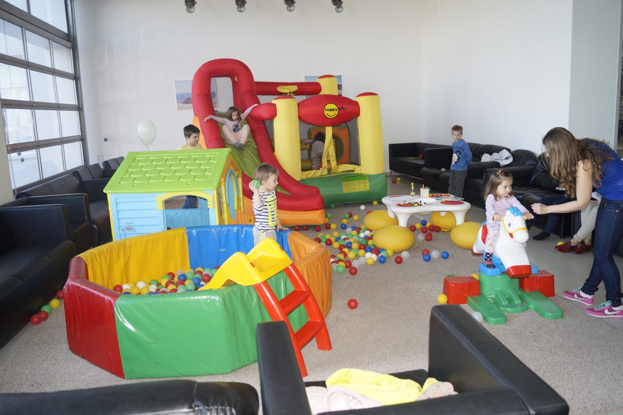 организована детская игровая зона в салоне продажи машин. Взрослые выбирают новые автомобили, дети весело играют